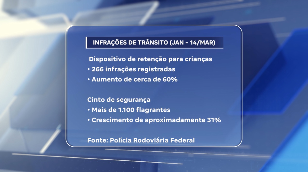Entre 1º de janeiro e 14 de março de 2026, foram registradas 266 infrações por ausência de DRC, como a cadeirinha, nas rodovias federais do estado. No mesmo período de 2025, haviam sido contabilizados 166 casos, o que representa um aumento de aproximadamente 60%. Em relação ao uso do cinto de segurança, foram 1.103 flagrantes neste ano, contra 844 no mesmo intervalo de 2025. O crescimento é de cerca de 31%, indicando também um aumento preocupante desse tipo de irregularidade nas estradas.